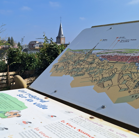 Dès le départ, nous avons proposé d’enrichir le dispositif pour avoir un véritable outil d’interprétation du panorama. S’orienter c’est bien. où la genèse du territoire namurois (ville haute, ville basse, quartiers hors-les-murs, …) peut être acrochée à différents marqueurs paysagers (citadelle, cathédrale, gare, … ) réinscrits dans leur contexte géohistorique. Le tout complété par une analyse paysagère fine du territoire de Bomel.